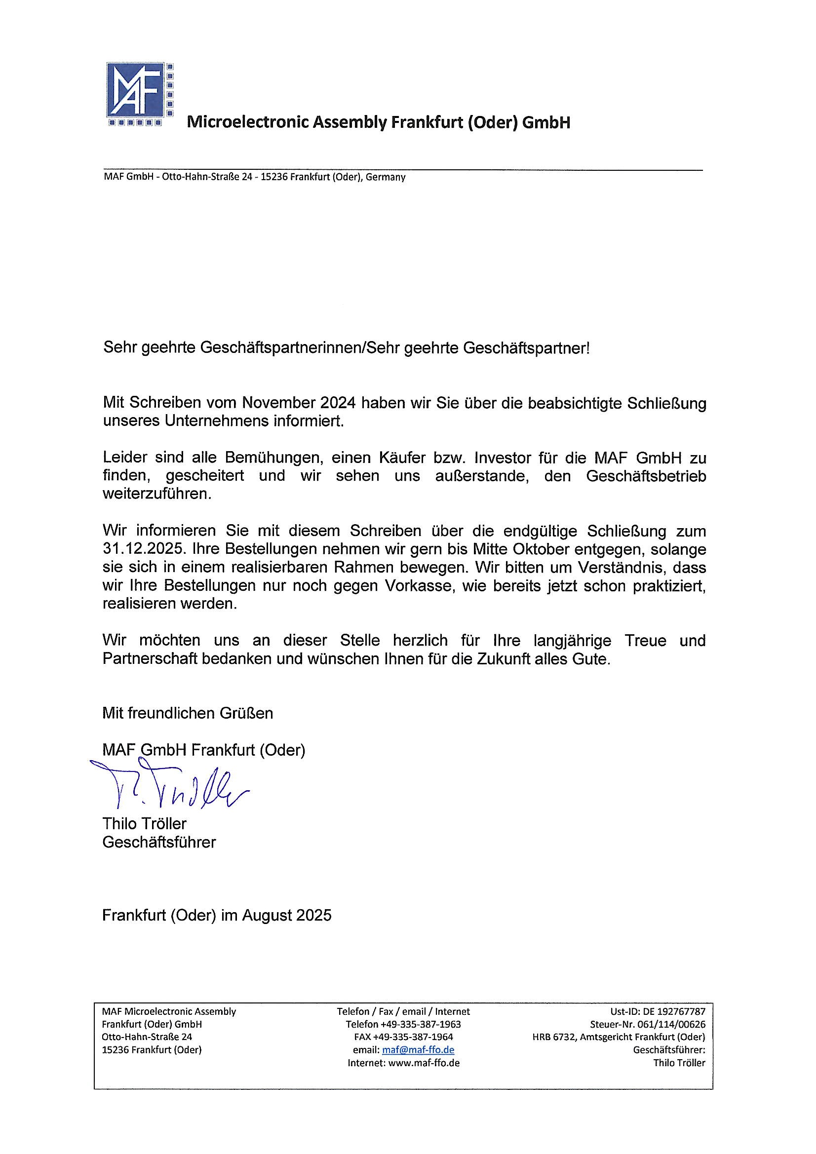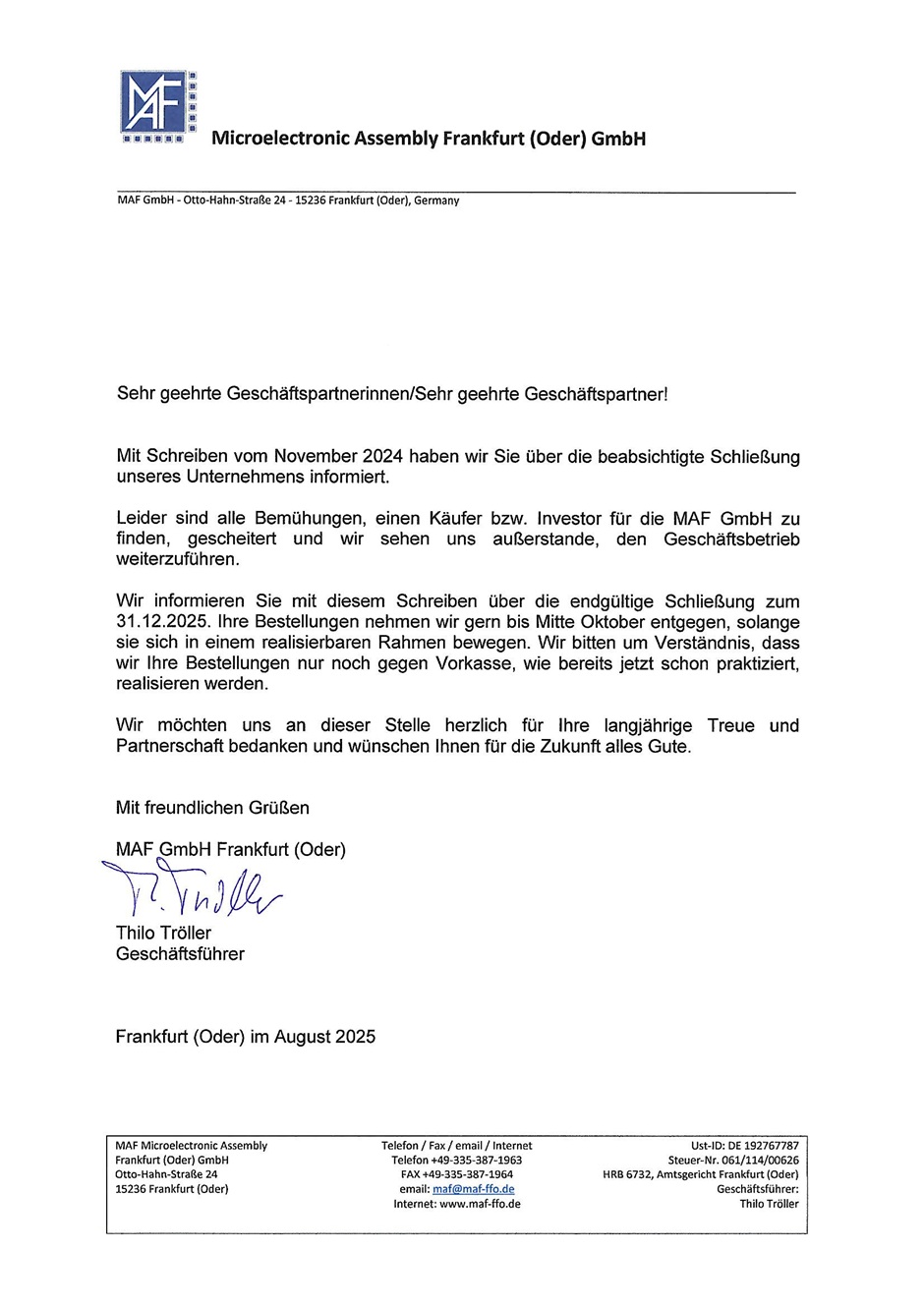 MAF Microelectronic Assembly Frankfurt (Oder) GmbHOtto-Hahn-Straße 2415236 Frankfurt (Oder)